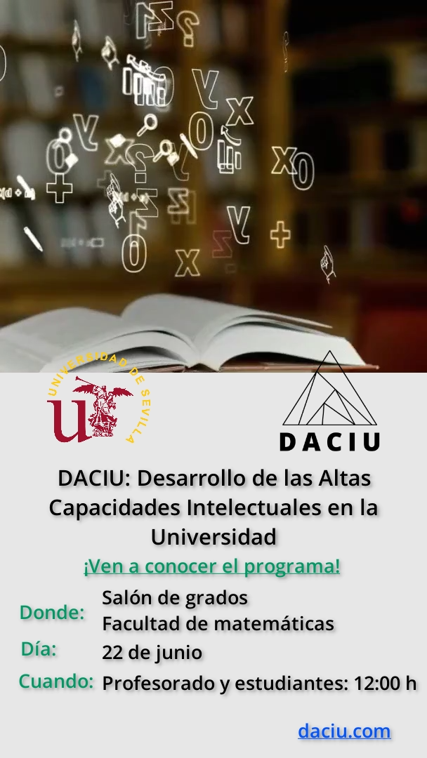 El próximo día 22 de junio a las 12 horas, en el salón de grados de la Facultad de Matemáticas, se celebrará una sesión informativa sobre el programa DACIU, Desarrollo de Altas Capacidades Intelectuales en la Universidad. El programa pretende atender a las necesidades específicas del alumnado de altas capacidades en la US.