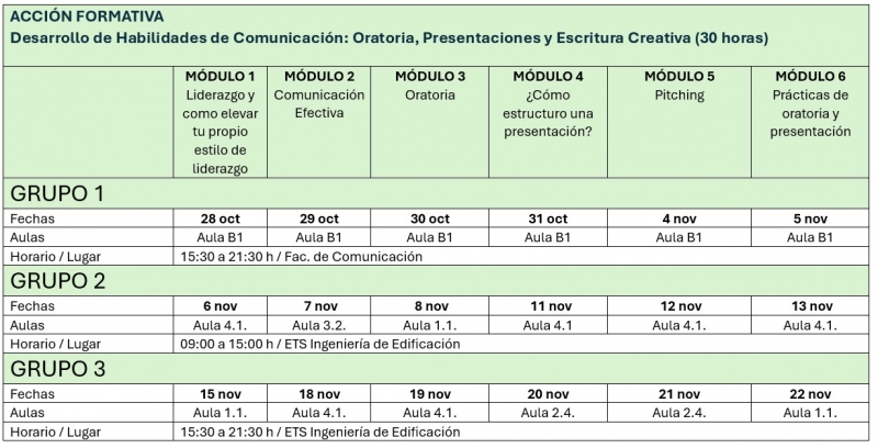 - Desarrollo de Habilidades de Comunicación, Oratoria, Presentaciones y Escritura Creativa.
